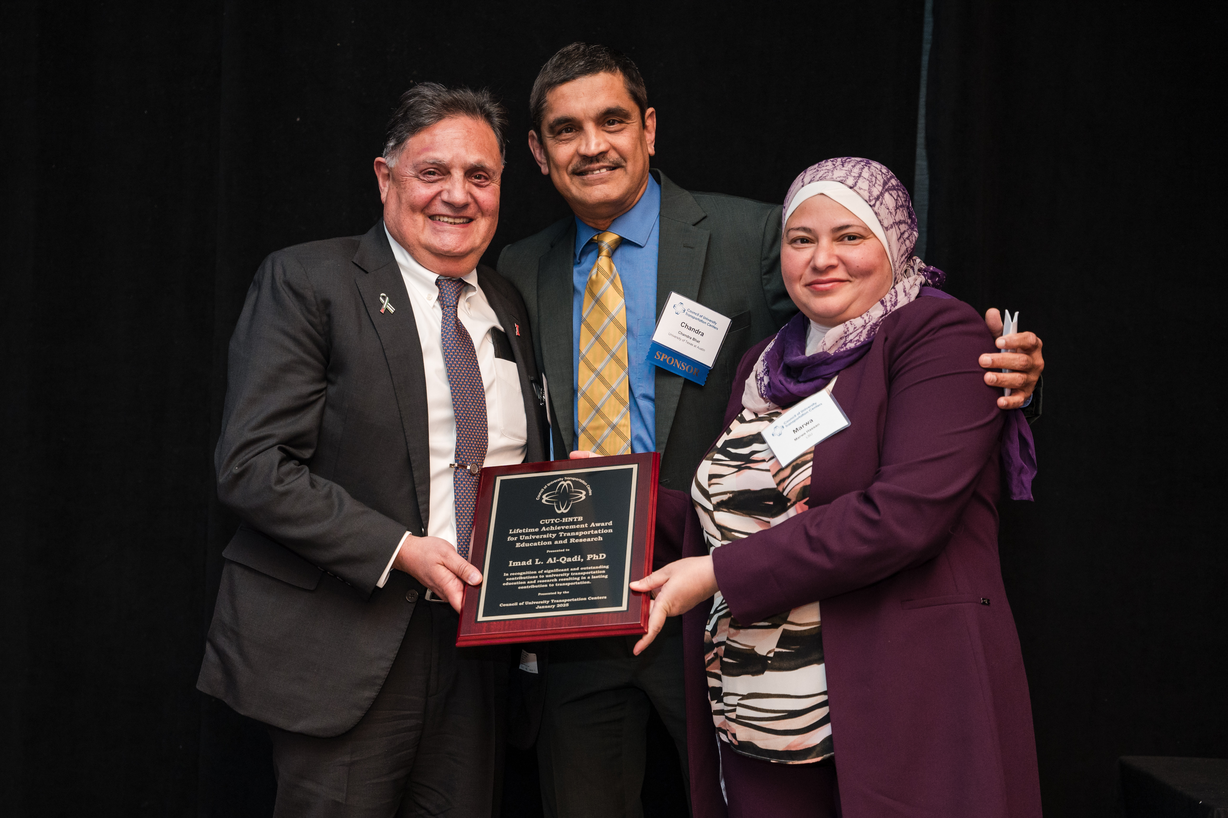 From left: Al-Qadi smiling with Chandra Bhat, Joe J. King Chair in Engineering at the University of Texas at Austin, and CUTC Presidents Marwa Hassan at the award ceremony in Washington, D.C. on Jan. 4.