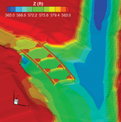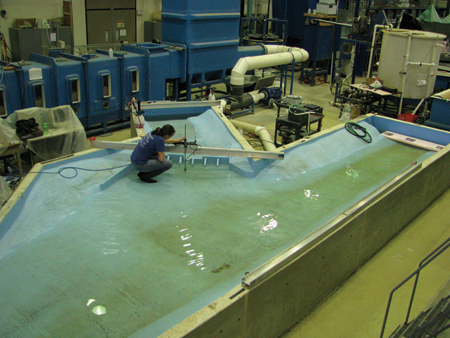 First, the MWRD surveyed the channel, the bank areas, and the river flow. These data were converted to cross-sections and a concrete basin 1/20th scale model built by CEE research staff in the Ven Te Chow Hydrosystems Laboratory. Specifications were based on earlier research within CEE sponsored by the Illinois Department of Natural Resources. Graduate research assistant Christiana Barnas (BS 07) has taken flow velocity measurements in the model for the last two semesters as part of an independent study project. Data are being processed by academic staff assistant for the CEE hydro lab, Andrew R. Waratuke (BS 97, MS 99).