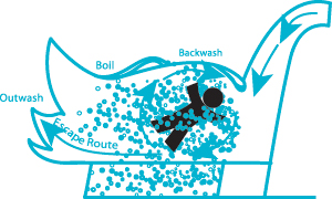 2. A dam can act as a "drowning machine," as shown in this illustration by Joyce Mast.