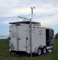 At Whidbey Island, one radar uses a parabolic dish antenna, while the other has an array antenna. At Seattle-Tacoma, one installation has two dish antenna radars sitting on top of an administration building, and a radar with an array antenna is used on the airfield. The difference between array and dish antennas is beam coverage. The array antenna sends out a signal that sweeps plus or minus 11 degrees from horizontal, providing coverage from the ground to 11 degrees up from horizontal. The array configuration provides information on the range to target, but no altitude information. The parabolic dish antenna sends out a four-degree cone with an angle adjustment that provides better altitude discrimination. The radars generate data that can show the real-time movements of birds around the Seattle Airport. A visual display of bird movements is available on Google Earth.