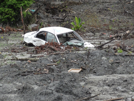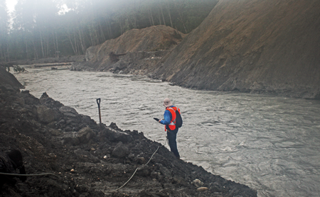 The group investigated the slide mass and debris field, took soil samples along the length of the slide mass and at the old river bottom, i.e., potential slide surface, and measured splash height and run-out distance at the slide margins. They also observed some of the man-made changes that resulted from the disaster clean-up, including a new river channel that was excavated to reduce flooding initiated when the original river was dammed by the slide mass and a temporary highway built to skirt the debris field while the original highway is cleared. Piles of totaled vehicles and other personal items pulled from the debris sit slightly off to the sides of the slide mass.