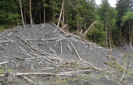 One notable aspect of the powerful slide, which crossed a river and traveled almost a mile before coming to a stop, is visible evidence of a high splash zone which is evident from mud marks at various heights on trees along the sides, middle, and toe of the slide. Stark said that the extent and flowing pattern of the run-up indicates that the slide behaved like a fluid rather than as intact overconsolidated soil.