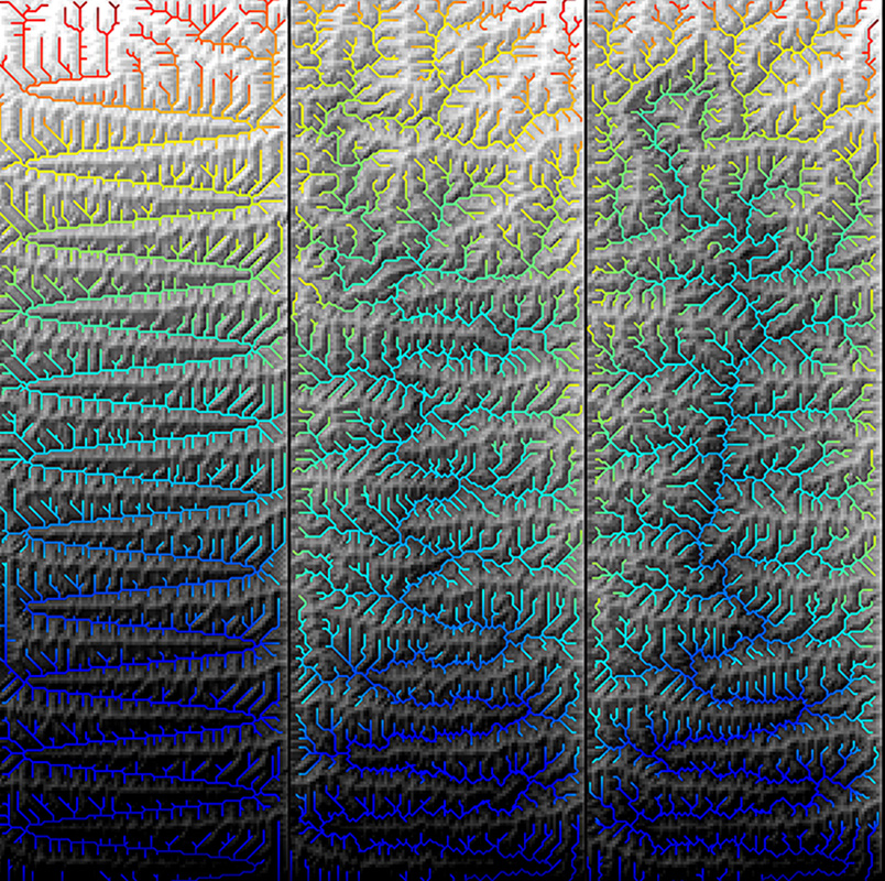 At the 5 million-year mark, the team introduced to the model a vertical and lateral erosion scenario, developed by Langston and University of Colorado, Boulder professor Gregory Tucker. The channels begin to migrate and reorganize the river network into a more realistic dendritic pattern.