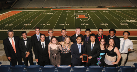 Team members and friends at the awards banquet, held at the Colonnades Club at Memorial Stadium. Left to right, back row: David Lange, Armen Amirkhanian, Mark Keller, Raphael Stern, Colin Rueb, Jonathan Daly, Luis Garay, Paul Papazisi, Robert Butler, Charlie Yu. Left to right, front row: Dan Levitus, Arielle Malinowski, Alex Prasauskas, Hong Kim, Min Yin, Sharla Evatt, Jennifer Zablotny.