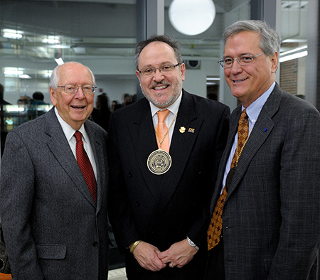 Special guests at the investiture included García’s wife, Estela, and their daughter, Emma; former University of Illinois Chancellor and Emeritus Professor of Psychology Morton W. Weir and his wife, Cecelia; and Jon Khachaturian (BS 78), president of Versabar Inc., who with his wife, Bobbi, made a gift to name Khachaturian Hall, where the investiture was held, after Jon's father, Narbey Khachaturian (BS 47, MS 48, PhD 52), deceased professor emeritus of CEE.