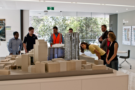 Brad Sugar (left), Project Manager for 1 Central Park, explains the project to GLCM students using an elaborate architectural model. Photo by Pedro Alvarez, GLCM student.
