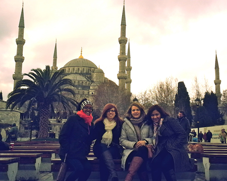 Four GLCM students at the Blue Mosque: (left to right) Liz Tewolde, Zorina Disheva, Ana Lucuta, Amna Mahmud.