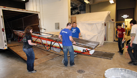 Team members load this year’s canoe onto their trailer April 18 on the way to the regional competition at Trine University in Indiana.