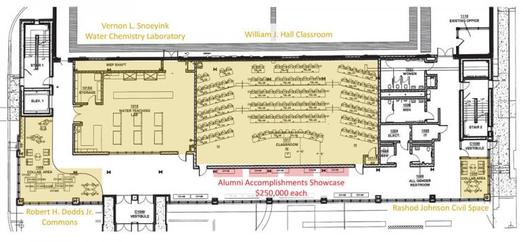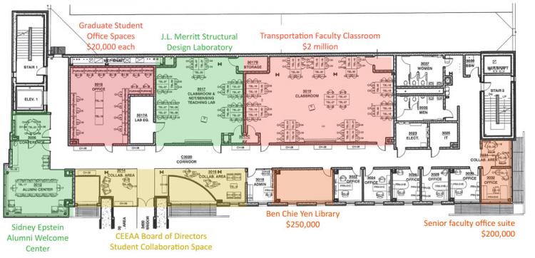 Plans for Phase II of CEE's Modernization project are well underway and fundraising has been very successful to date. Below are some details and floor plans for various aspects of this initiative, and ways for alumni and friends to help make CEE history with this major transformation of our facilities. All donors will be acknowledged on the donor installation within the building and in spaces where naming gifts have been made.