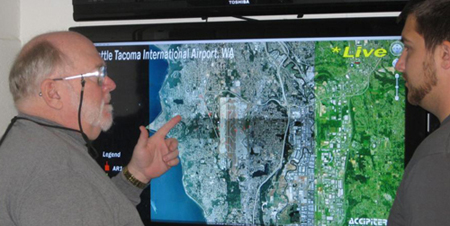 Professor Herricks explains live image of Seattle-Tacoma International Airport avian radar information to staff in the Center of Excellence for Airport Technology office at the University of Illinois.