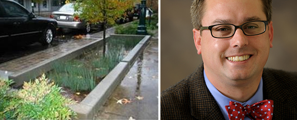 At top: (left) One of the streetscapes being designed and studied by the Smart Cities project is one with infiltration planters, image courtesy of U.S. Environmental Protection Agency; (right) Joshua Peschel