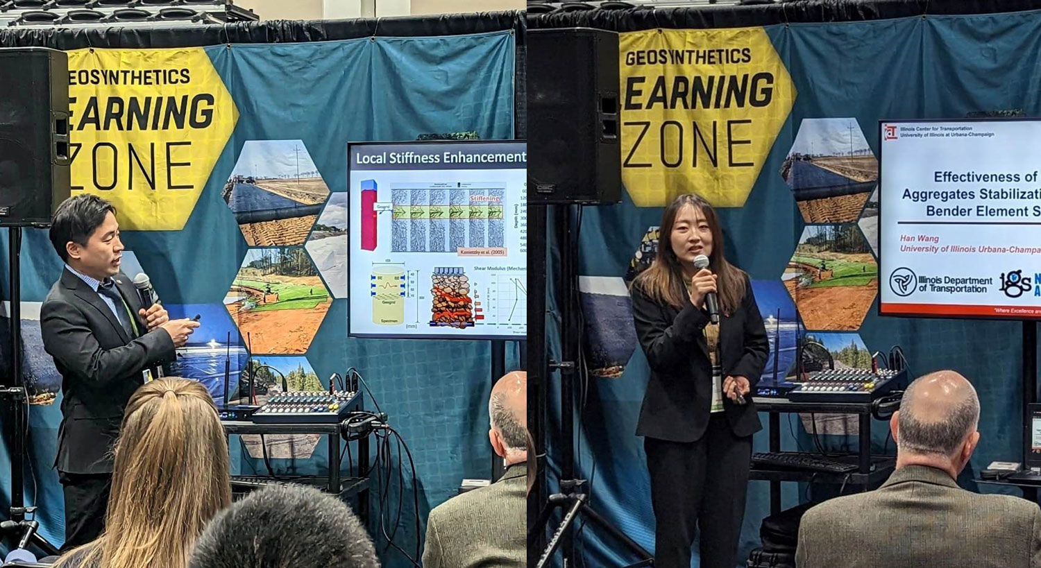 Two CEE at Illinois students, Mingu Kang and Han Wang, won top prizes at the Geosynthetics Conference 2023 student research showcase. The event, organized by the Geosynthetic Materials Association (GMA) and IGS North America, presented groundbreaking research on geosynthetics and their applications.