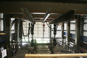 RAIL includes several machines capable of conducting tests of railway crossties, as well as a full-scale track loading system. The full-scale system enables study of load transfer from the wheels into the track, ballast, sub-ballast and subgrade. It includes 22 feet of track and a full 5-foot deep substructure that allows researchers to see how changes in load affect interactions throughout the entire system instead of just one element. Loading occurs using an instrumented railcar axle and wheels to simulate actual wheel-rail contact conditions. The system can measure loads and perform static or pulsing dynamic tests at one location with the possibility of measuring rolling dynamic loads in the future.