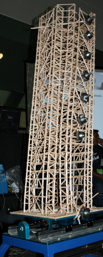 The competition challenges students to design a multi-story commercial office building and predict its seismic load resistance capacity. A scale model of the design made from balsa wood is equipped with weights and tested against three seismic events. The designs have strict criteria each team must follow, including a weight limit of 2.2 kg, maximum floor width of 15 x 15 square inches, a maximum allowable 29 levels, and maximum floor heights of 2 inches. Rules also allow for innovative floor isolation and damping systems.