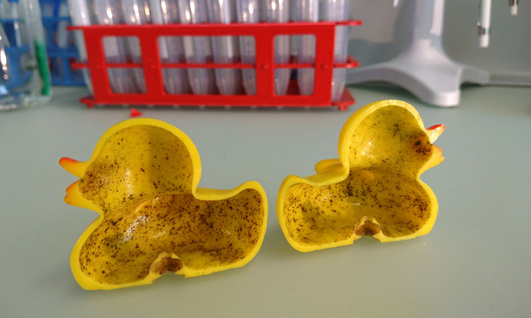 Ya ZhangWarm, humid bathrooms provide ideal conditions for the formation of bacterial and fungal biofilms – for example, on shower curtains or behind cabinets. This applies in particular to rubber ducks and other bath toys. Dense growths of bacteria and fungi are found on the inner surface of these flexible toys, and a murky liquid will often be released when they are squeezed by a child. The researchers from Eawag, ETH Zurich, and the University of Illinois set out to study the factors that favor microbial growth and the types of microorganisms present in bath toys. They characterized biofilm communities inside used bath toys and carried out controlled experiments with new bath toys, under conditions simulating household use. Over a period of 11 weeks, some of the toys were exposed to clean and others to dirty bath water, including constituents such as soap, human body fluids and bacteria. The bath toys were subsequently bisected and analyzed in the laboratory. The findings are enough to make parents rethink their approach to bathtime fun: between 5 million and 75 million cells per square centimeter were observed on the inner surfaces. The composition of the biofilm communities varied widely, especially among the bath toys from real households, but also between the two control groups. Fungal species were detected in almost 60 percent of the real bath toys and in all the dirty-water control toys. Potentially pathogenic bacteria were identified in 80 percent of all the toys studied, including Legionella and Pseudomonas aeruginosa, the rod‑shaped bacterium often implicated in hospital-acquired infections.