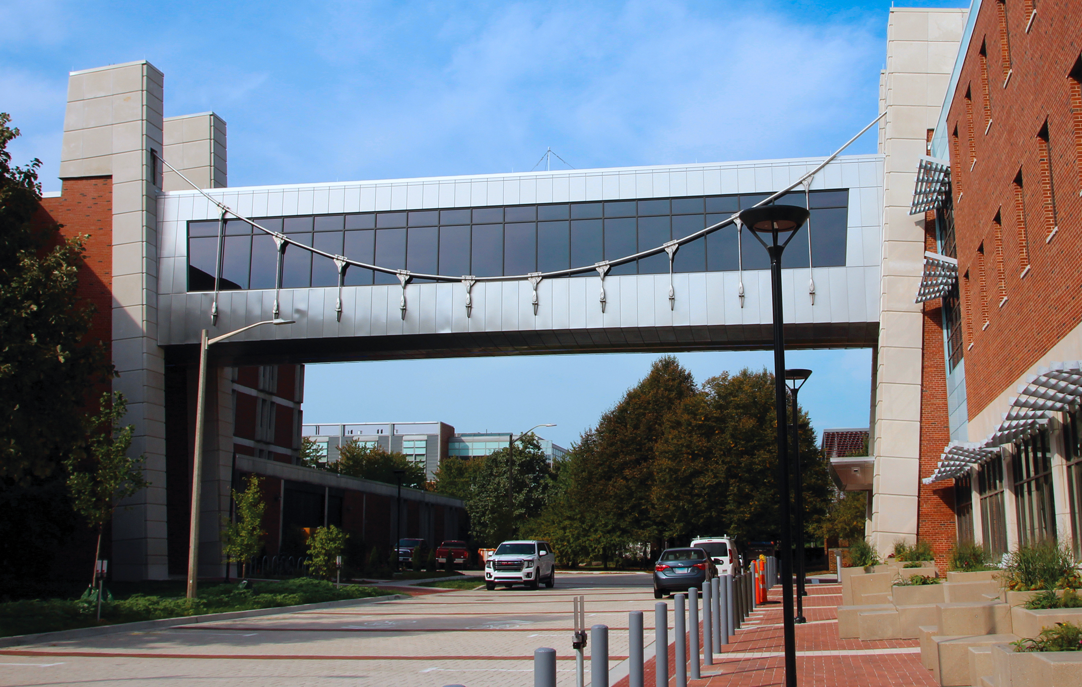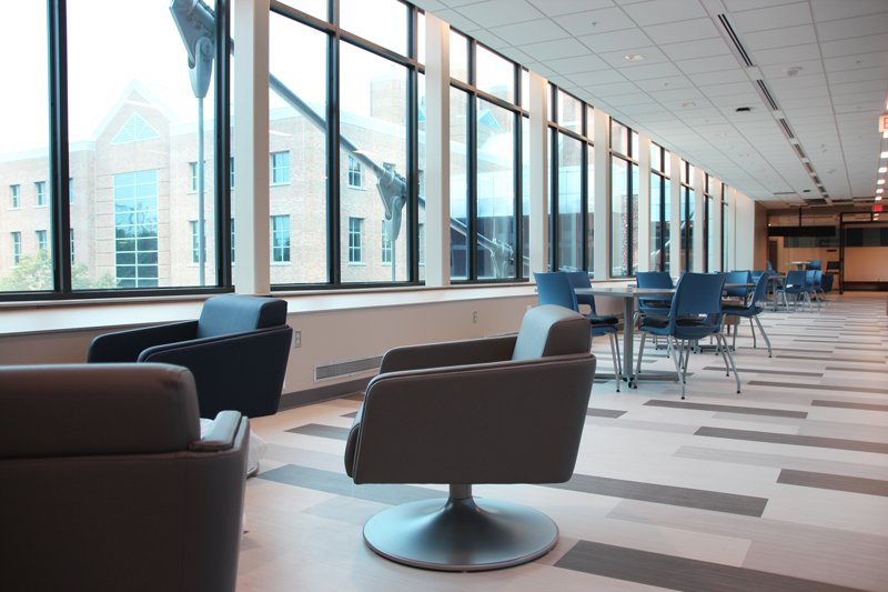 Collaboration areas inside the bridge provide students a place to study, work together and pass time between classes.